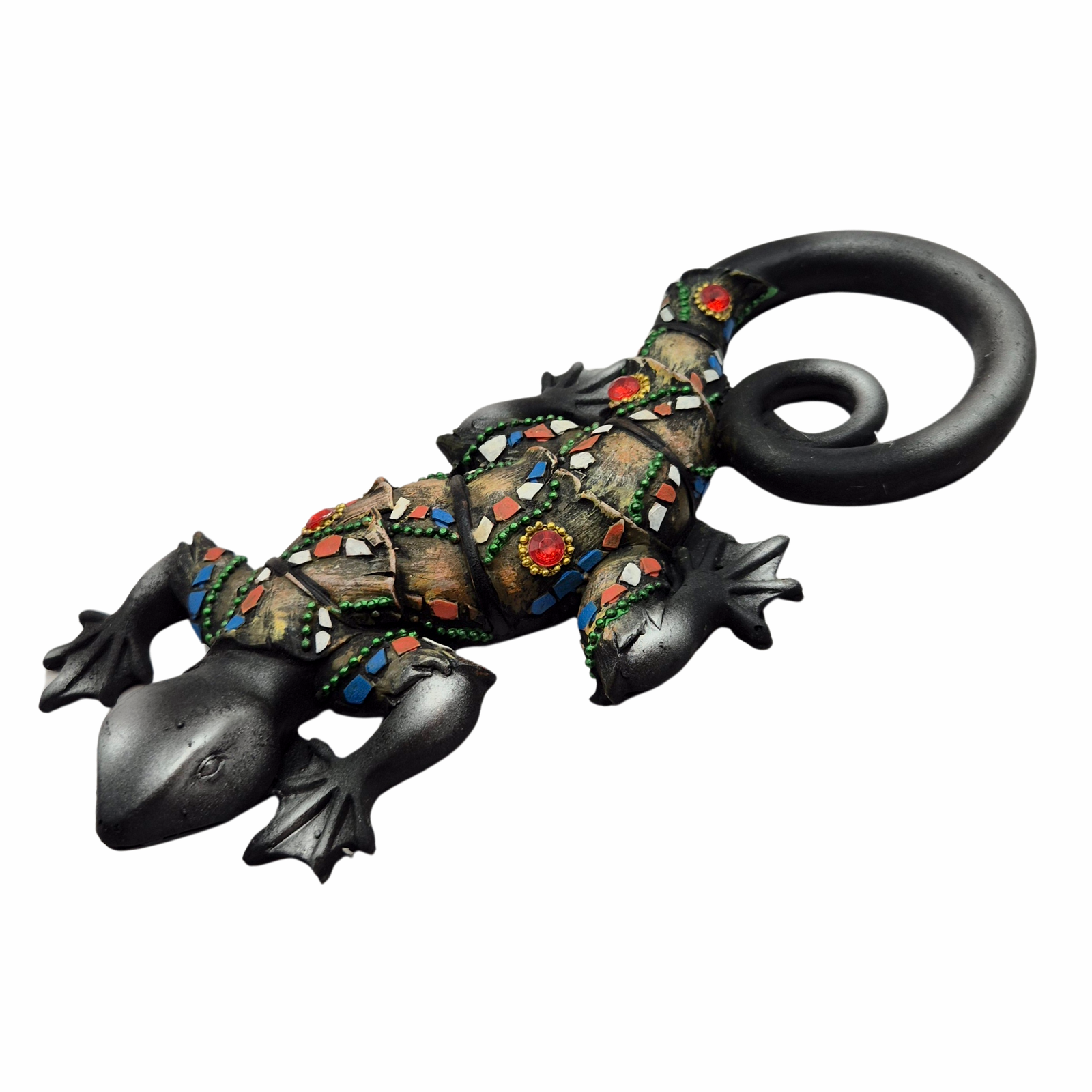 פסלון לטאה דקורטיבי בעבודת יד, מעוטר בפסיפס צבעוני ועיטורים אמנותיים בסגנון בוהמייני-אתני. מראה חי ומלא אופי, שמוסיף נוכחות וצבע לכל קיר, מרפסת או פינת עיצוב. בגב הפסלון משולב מתלה ייעודי, המאפשר תלייה נוחה ובטוחה. הלטאה נחשבת בתרבויות רבות כסמל למזל טוב, התחדשות והסתגלות, ולכן זוהי מתנה מושלמת ומלאת משמעות וברכה לחנוכת בית או לבית חדש.