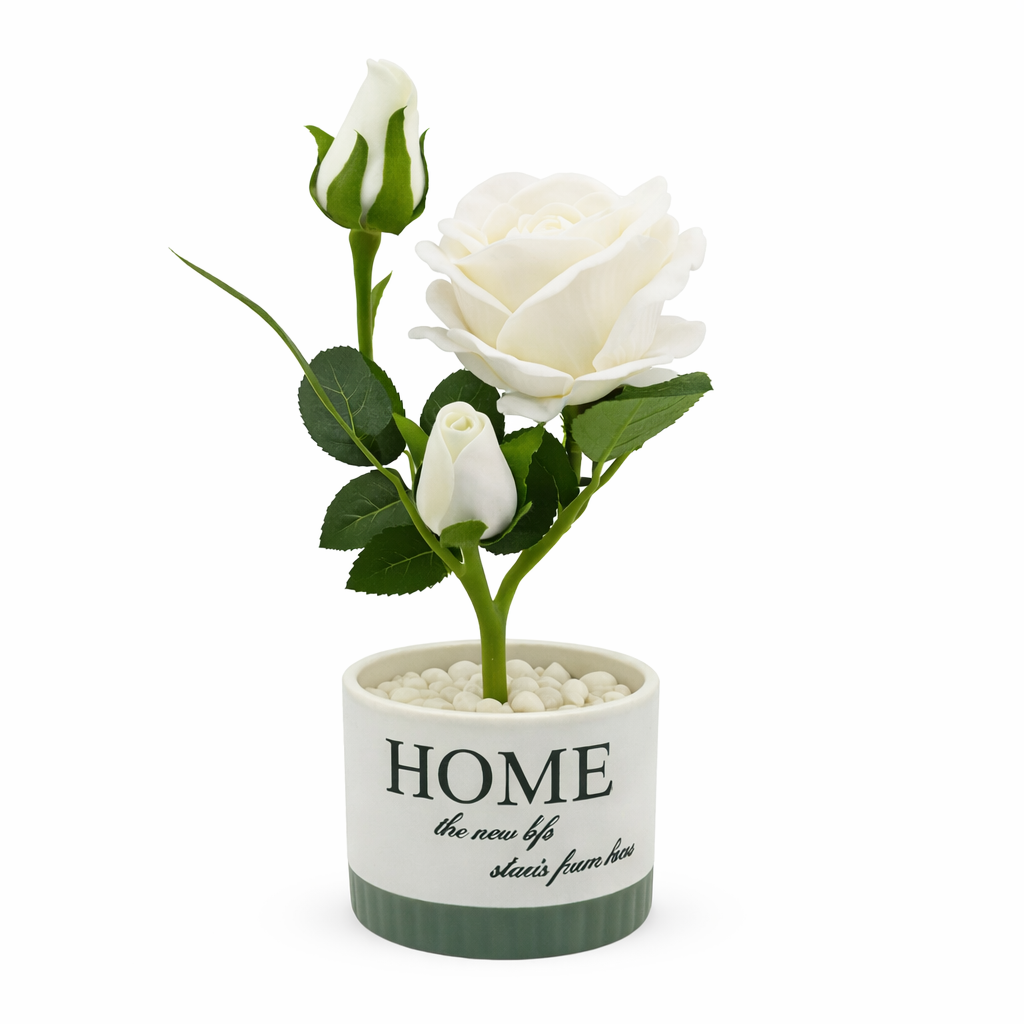 עציץ דקורטיבי מעוצב בקפידה עם ורדים מלאכותיים בצבע לבן צחור, המסמלים אהבה, עוצמה ותשוקה. הוורדים עשויים מחומר איכותי המדמה מראה טבעי ומלא חיים, ומגיעים בעציץ קרמי לבן עם הכיתוב HOME – המוסיף תחושת חמימות וביתיות. מושלם לקישוט שולחן, חדר שינה, סלון או משרד, ומשרה אווירה רומנטית ונעימה בכל חלל.