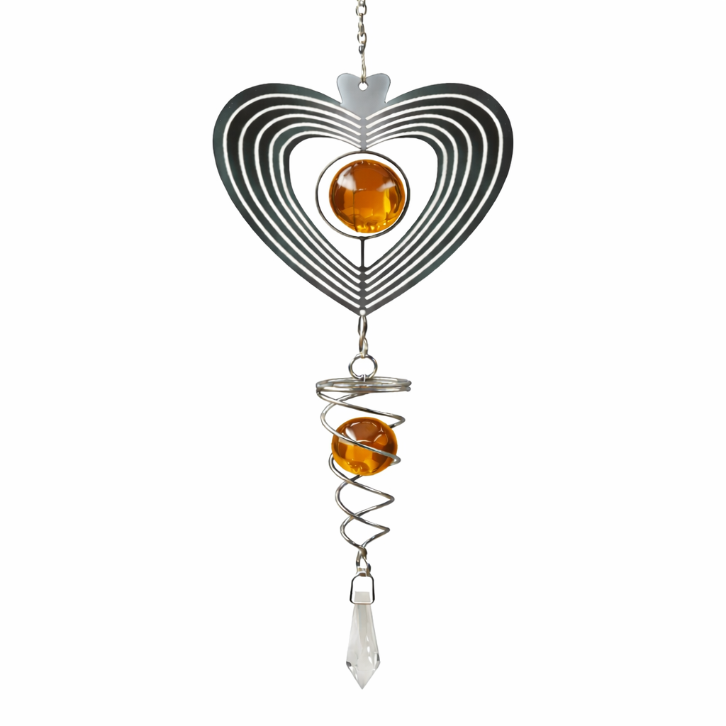 מובייל תלייה בעיצוב לב ספירלי בגימור כסוף, עם קריסטלים בגוון חום־ענברי חמים. הענבר משדר יציבות, קרקוע וביטחון, והתנועה ברוח מוסיפה עומק ונוכחות רגועה לחלל. מתאים לתלייה בבית, במרפסת מקורה, ליד חלון או בפינת מדיטציה, ומשלב עיצוב אסתטי עם משמעות רוחנית.