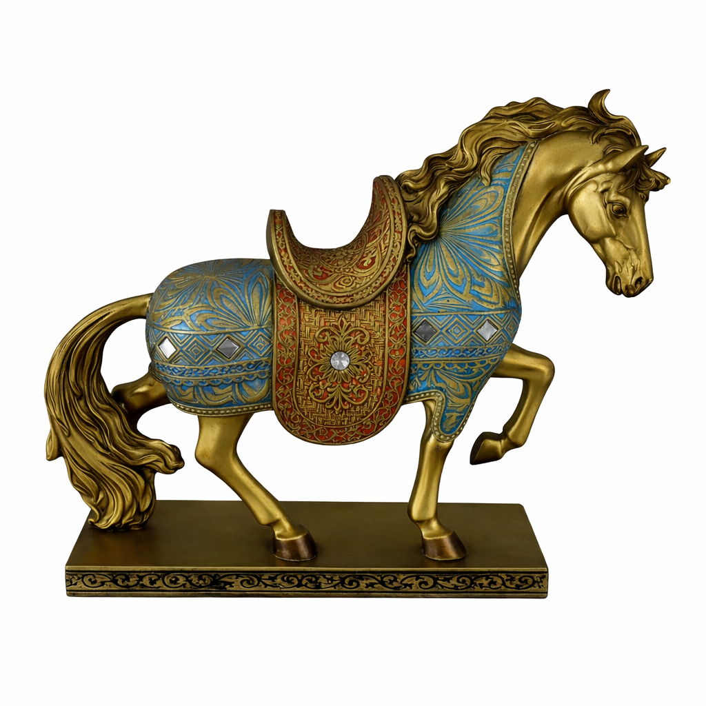 פסלון סוס דקורטיבי בעיצוב מלכותי ועשיר, בגימור זהב עם עיטורים בגוון טורקיז ודוגמאות אוריינטליות עדינות. הסוס ניצב בתנוחה אלגנטית ומלאת תנועה, המשדרת עוצמה, חופש ויוקרה. פריט מרשים שמוסיף נוכחות ואופי לכל חלל – סלון, משרד, ספרייה, פינת אירוח או כמתנה יוקרתית לחובבי עיצוב ואמנות.