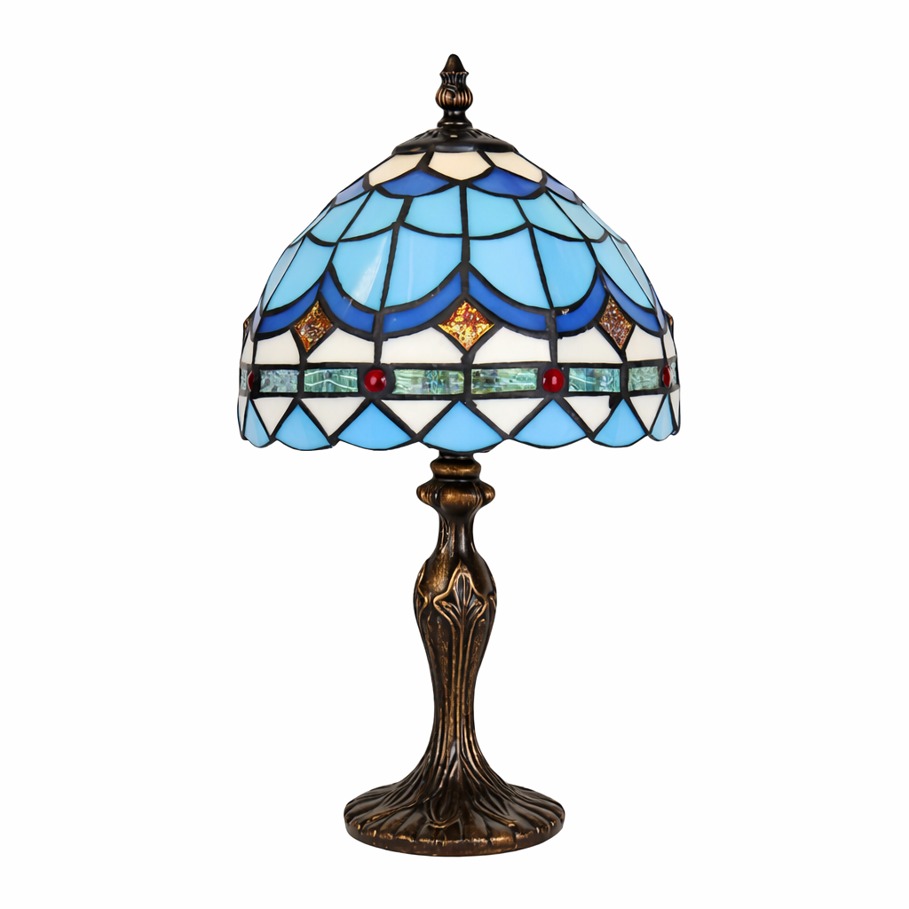 מנורת שולחן בסגנון טיפאני עם אהיל זכוכית צבעונית בגווני כחול, תכלת ולבן, בשילוב נגיעות אדומות ועדינות זהובות. דוגמת הקשתות יוצרת מראה הרמוני, רגוע ואלגנטי, המפיץ אור רך ונעים בחלל. בסיס מתכתי מעוצב בגימור כהה מעניק למנורה יציבות ומראה קלאסי. מתאימה לסלון, חדר שינה, שידה, פינת קריאה, משרד או קליניקה – כפריט תאורה שהוא גם אלמנט עיצובי מרשים.