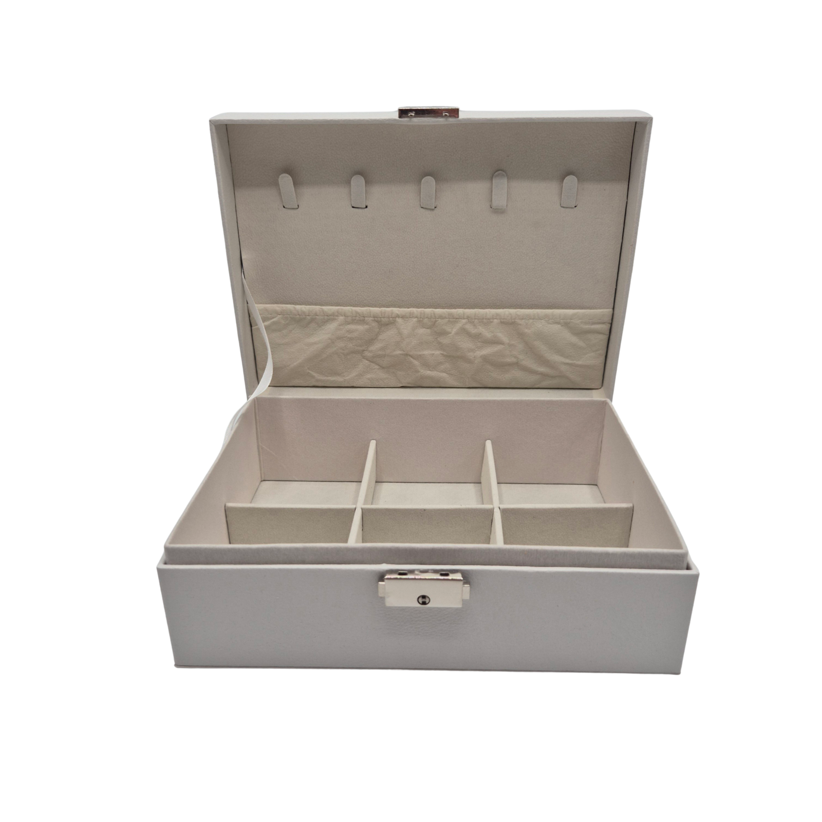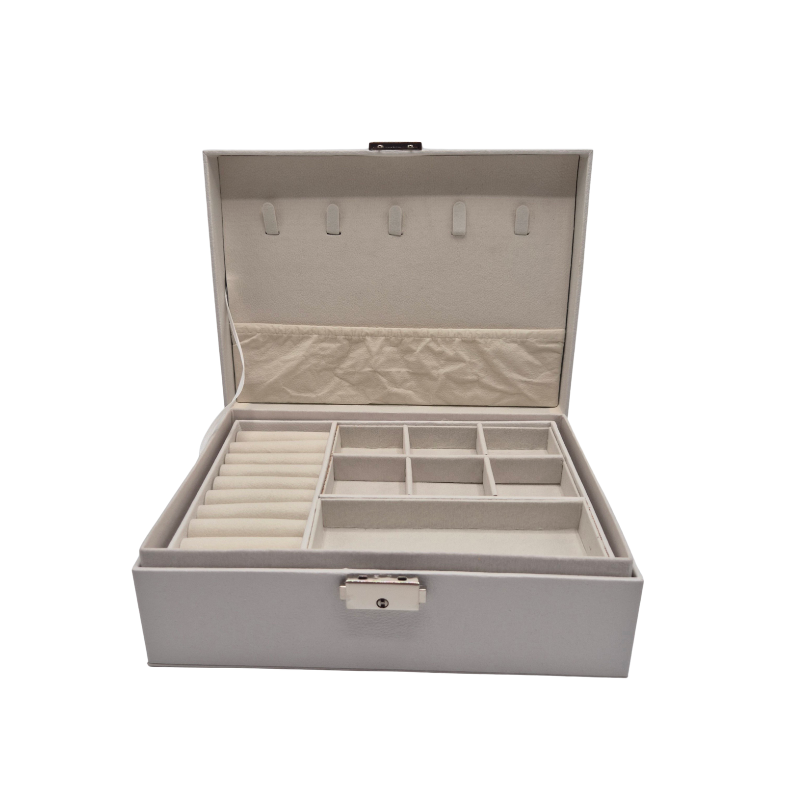 קופסת תכשיטים לבנה בעלת שתי קומות אחסון, בעיצוב יוקרתי ונקי. הקופסה עשויה חומר קשיח מצופה בגימור מט איכותי, עם מנגנון סגירה מתכתי מלוטש וריפוד פנימי רך ונעים בגוון בהיר. השכבה העליונה כוללת תאים לטבעות, עגילים ושרשראות קצרות, ואילו השכבה התחתונה מיועדת לפריטים גדולים יותר – צמידים, שרשראות ארוכות או שעונים. שילוב מושלם של אסתטיקה, נוחות ויוקרה, המעניק לכל תכשיט מקום משלו. מתאימה לשידות, חדרי הלבשה, או כמתנה מעוצבת לאישה האוהבת סדר ואלגנטיות.