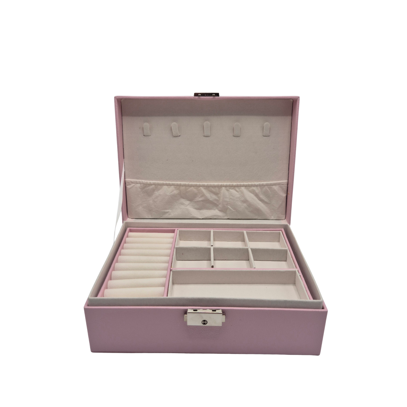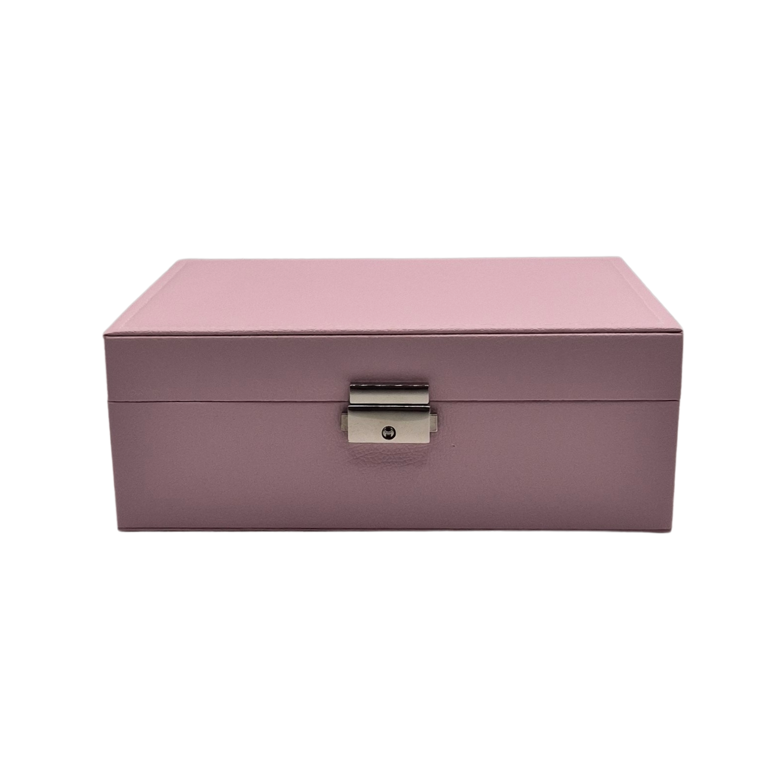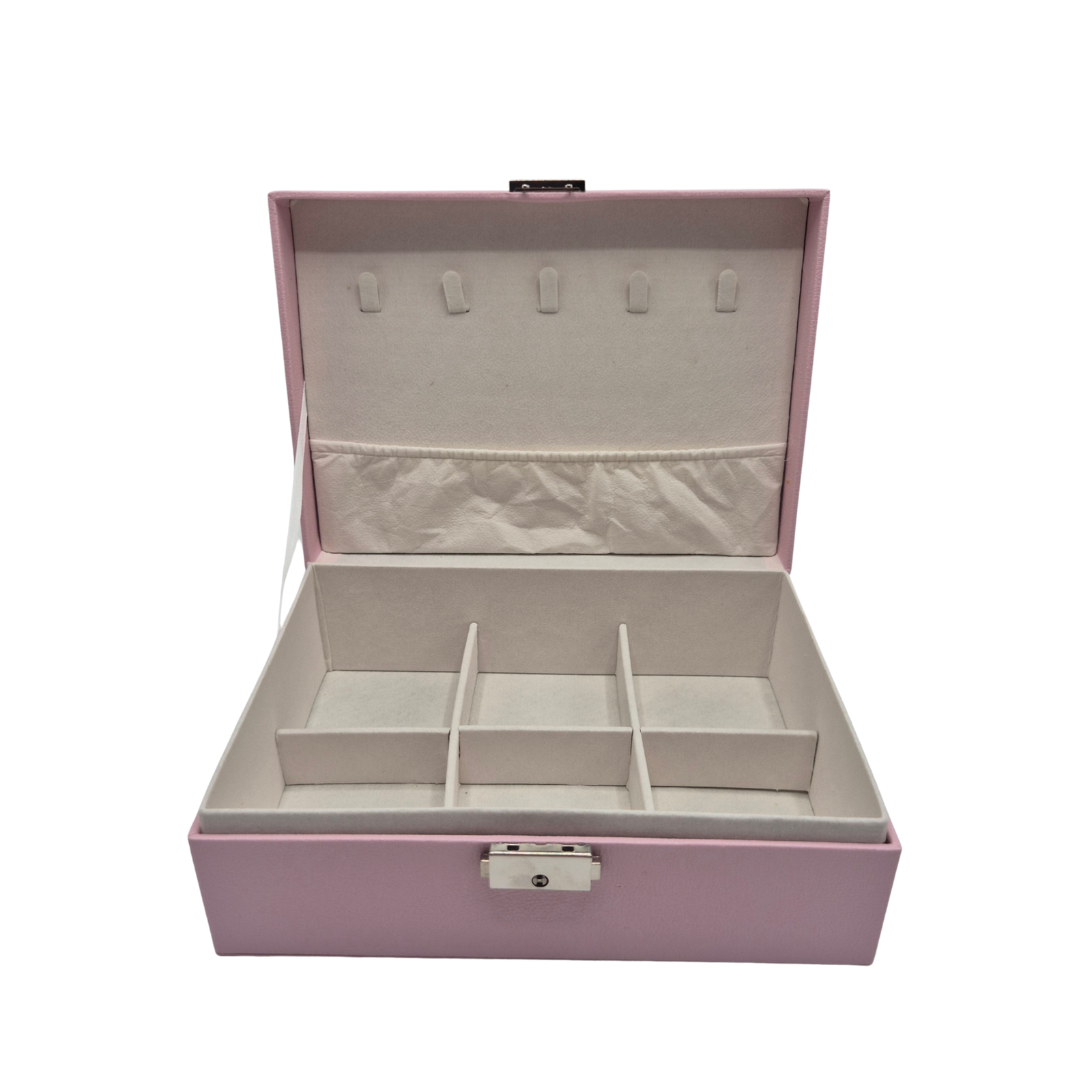 קופסת תכשיטים ורודה בעלת שתי קומות אחסון, בעיצוב יוקרתי ונקי. הקופסה עשויה חומר קשיח מצופה בגימור מט איכותי, עם מנגנון סגירה מתכתי מלוטש וריפוד פנימי רך ונעים בגוון בהיר. השכבה העליונה כוללת תאים לטבעות, עגילים ושרשראות קצרות, ואילו השכבה התחתונה מיועדת לפריטים גדולים יותר – צמידים, שרשראות ארוכות או שעונים. שילוב מושלם של אסתטיקה, נוחות ויוקרה, המעניק לכל תכשיט מקום משלו. מתאימה לשידות, חדרי הלבשה, או כמתנה מעוצבת לאישה האוהבת סדר ואלגנטיות.