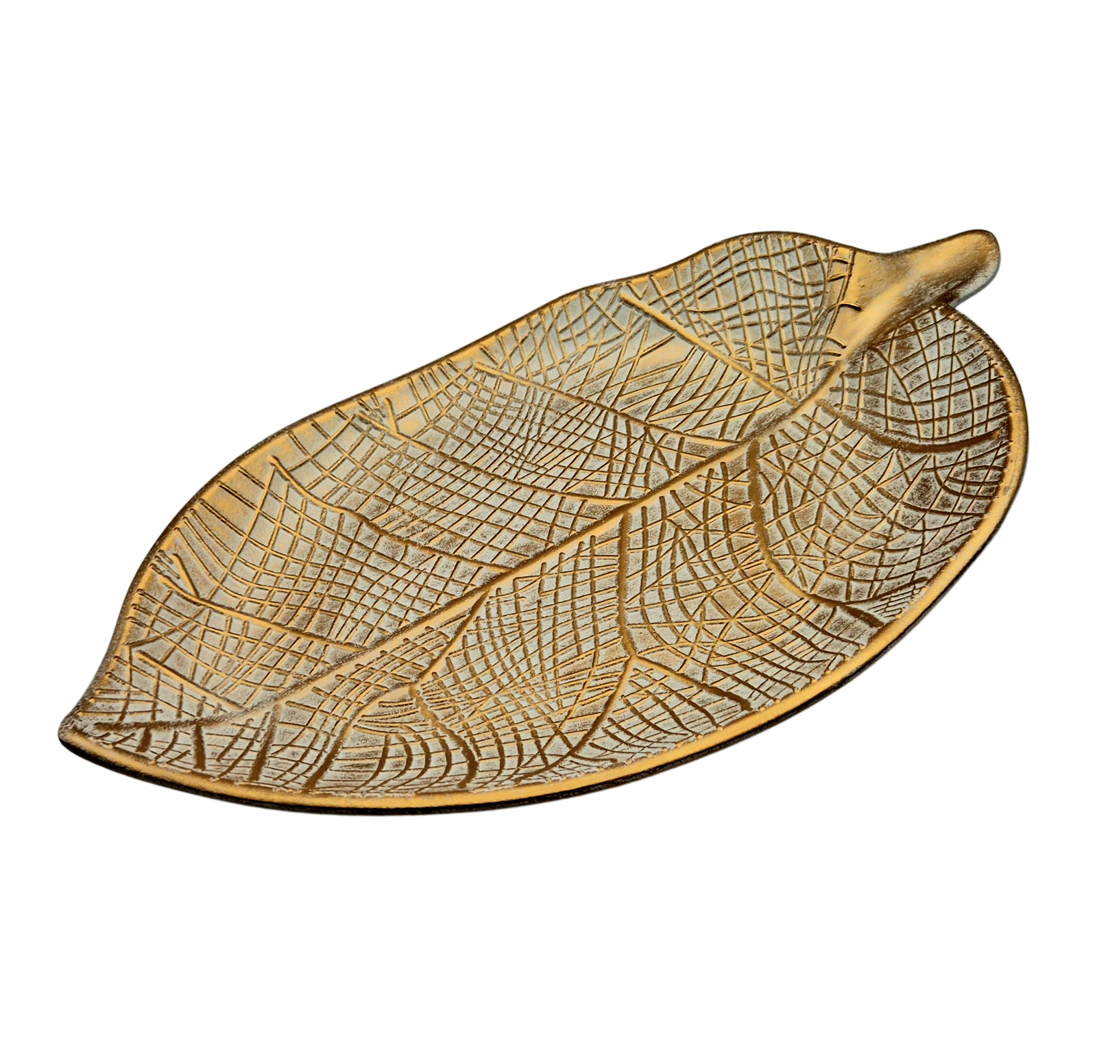 מגש עץ דקורטיבי בצורת עלה, בגוון זהב-עתיק עם טקסטורה עשירה ומראה וינטג' קלאסי. העיצוב המוזהב בשילוב אפקט הפטינה מעניק עומק ואופי ייחודי, ההופכים את המגש לפריט נוי מרשים ומתוחכם. אידיאלי להצגת תכשיטים, נרות, אביזרים קטנים או כאלמנט עיצובי בפני עצמו — מושלם לכל חלל המבקש נגיעה של אלגנטיות חמימה ונשמת וינטג'.