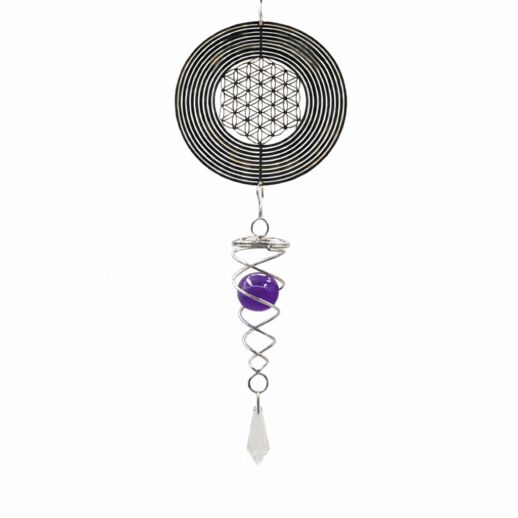 מובייל רוח דקורטיבי עשוי מתכת בגימור כסוף, בעיצוב פרח החיים – סמל גאומטרי עתיק המייצג הרמוניה, שלמות וזרימת אנרגיה בין גוף, נפש ותודעה. במרכז המובייל משולב קריסטל סגול המוסיף נוכחות אנרגטית, חיות ועומק חזותי. תנועתו הסיבובית עם זרימת האוויר יוצרת משחקי אור עדינים ואווירה מאוזנת ומרגיעה. מתאים לתלייה בבית, במרפסת מקורה, ליד חלון או בפינת מדיטציה ורוגע, ומשלב עיצוב אסתטי עם משמעות רוחנית.