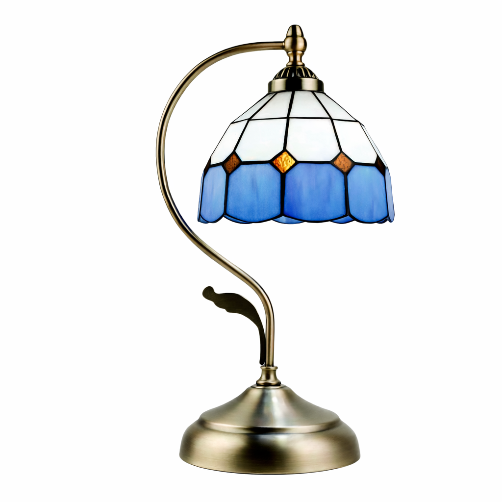 מנורת שולחן דקורטיבית בסגנון טיפאני עדין, עם אהיל זכוכית בגווני כחול ולבן המשולבים בדוגמה גאומטרית עדינה. שילוב הצבעים יוצר מראה נקי, אלגנטי ועל־זמני, בעוד בסיס המתכת המעוגל מעניק יציבות ונוכחות קלאסית. המנורה מפיצה אור רך ונעים, ומתאימה לשידת לילה, שולחן כתיבה, פינת קריאה או סלון, ומשתלבת היטב בעיצוב קלאסי, וינטג׳ או אלגנטי. פריט תאורה מעוצב שמוסיף עומק, רוגע ואופי לחלל.