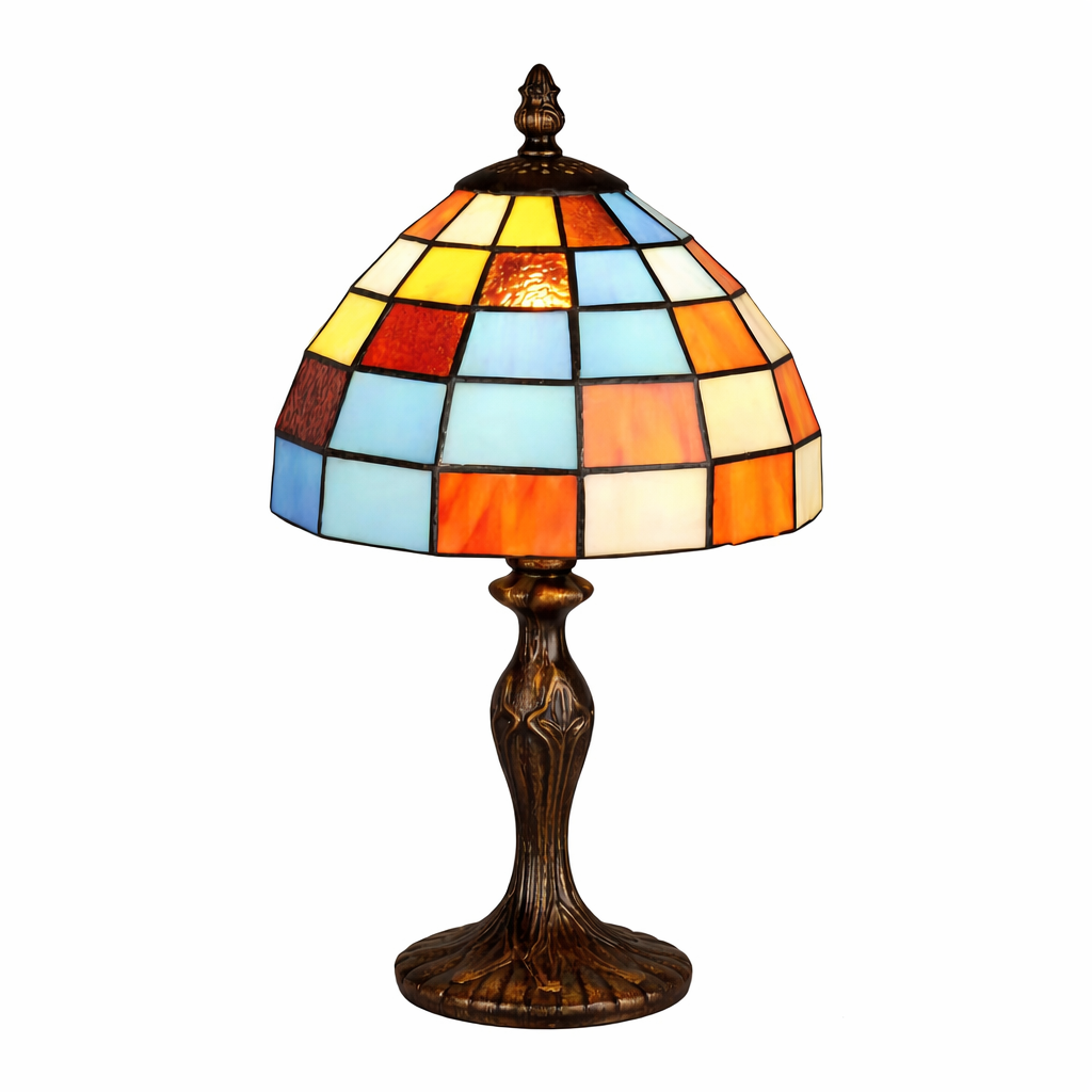 מנורת שולחן בעבודת ויטראז’ צבעונית, המשלבת גוונים של תכלת, כתום, קרם וחום ליצירת מראה חמים ומלא אופי. גוף המנורה מעוצב בסגנון קלאסי עם בסיס דקורטיבי כהה, ואהיל זכוכית מחולק לפסיפס ריבועים המדגיש את משחקי האור והצבע. מתאימה לסלון, חדר שינה, פינת קריאה או משרד ביתי, ומוסיפה לכל חלל תחושת וינטג’, עומק ועיצוב על־זמני.