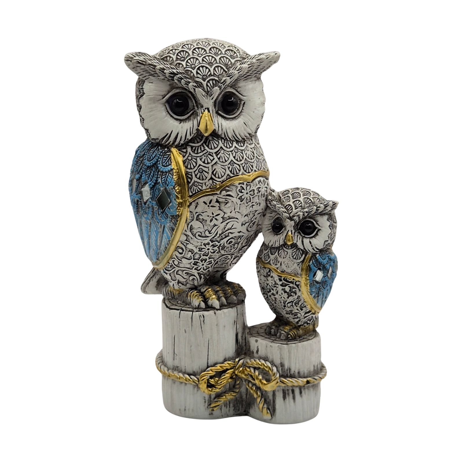 פסלון דקורטיבי מקסים של זוג ינשופים – ינשוף בוגר וינשוף גוזל – עשוי משרף איכותי עם צביעה מטאלית בגווני כסף, כחול וזהב. סמל לאהבה, הגנה ותבונה נצחית, מושלם כפריט נוי לכל חלל או כמתנה מיוחדת.