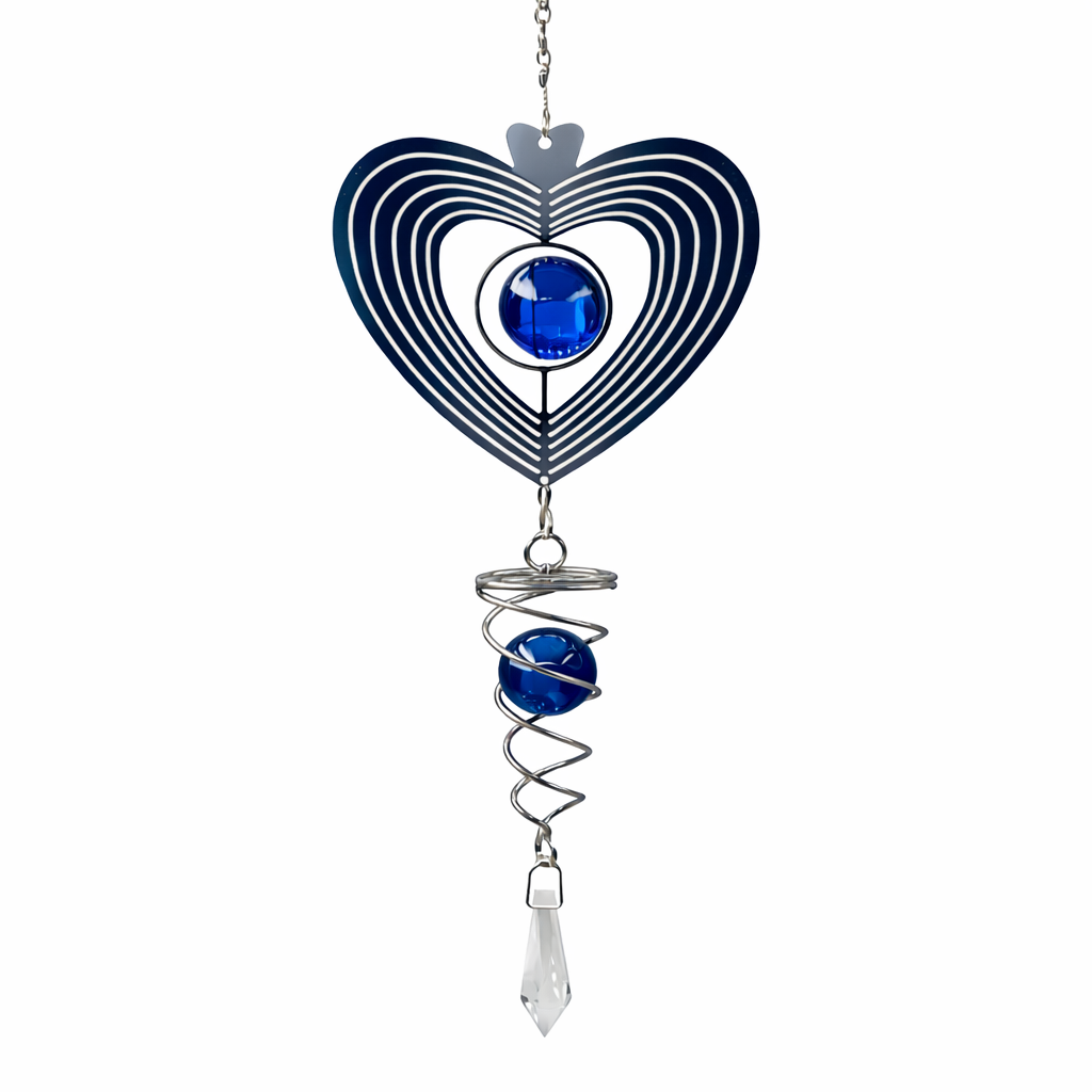 מובייל תלייה בעיצוב לב ספירלי, עשוי אלמנטים כסופים עדינים עם קריסטלים בגוון כחול עמוק. התנועה הסיבובית יוצרת משחק אור מרגיע ומאוזן, והקריסטל הכחול במרכז ובתלייה התחתונה מוסיף עומק, שקט ותחושת זרימה. מתאים לתלייה בבית, במרפסת מקורה, ליד חלון או בפינת מדיטציה, ומשלב עיצוב אסתטי עם משמעות רוחנית.
