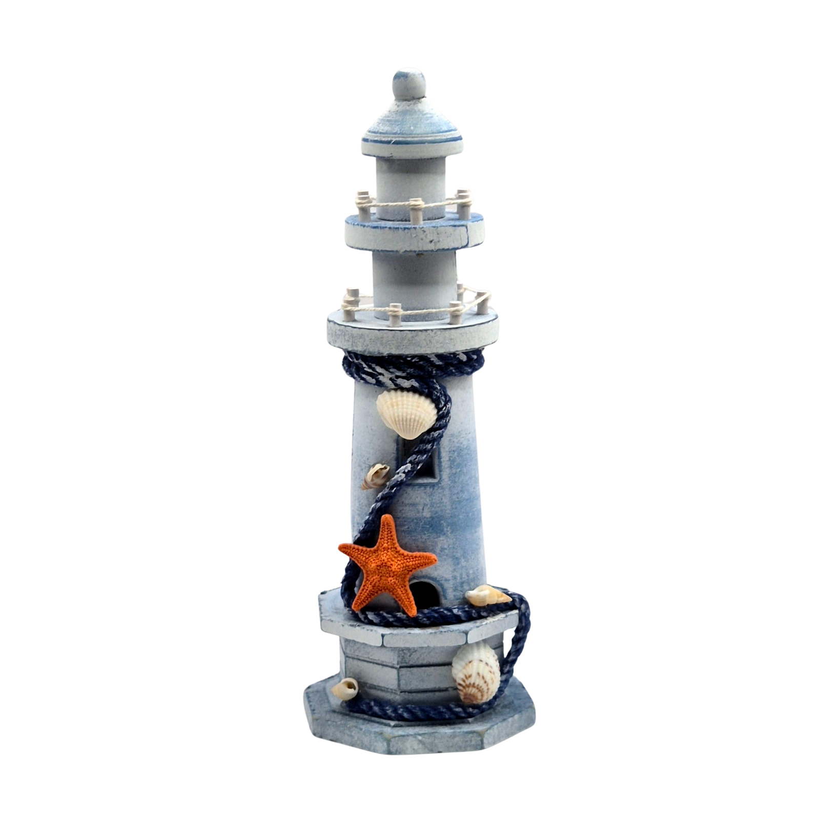 פריט דקורטיבי מעץ בעיצוב מגדלור ימי קלאסי, צבוע בגווני כחול-לבן בהירים עם מראה נושן ומלא אופי. מעוטר בחבל ימי כהה, צדפים טבעיים וכוכב ים כתום. מושלם לעיצוב חלל בסגנון ימי, לחדרי ילדים, למרפסת, לסלון או כמתנה לאוהבי הים והים התיכון.