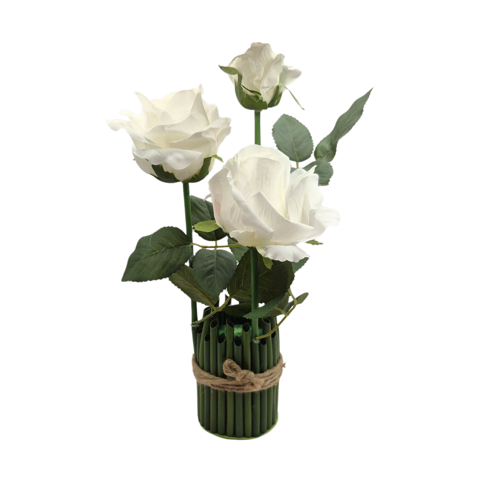 זר שושנים מלאכותיים בצבע לבן טהור, מסודר בקומפוזיציה אלגנטית בתוך כלי במבוק ירוק עם קשירה טבעית. הוורדים משדרים ניקיון, רוגע ואלגנטיות על-זמנית, ומשתלבים בהרמוניה מושלמת עם מראה טבעי ועדין. מתאים לעיצוב סלון, פינת אירוח, חדר שינה, קליניקה, משרד או כמתנה מעוצבת ומרגשת. ללא צורך בהשקיה או תחזוקה — יופי שנשמר לאורך זמן.