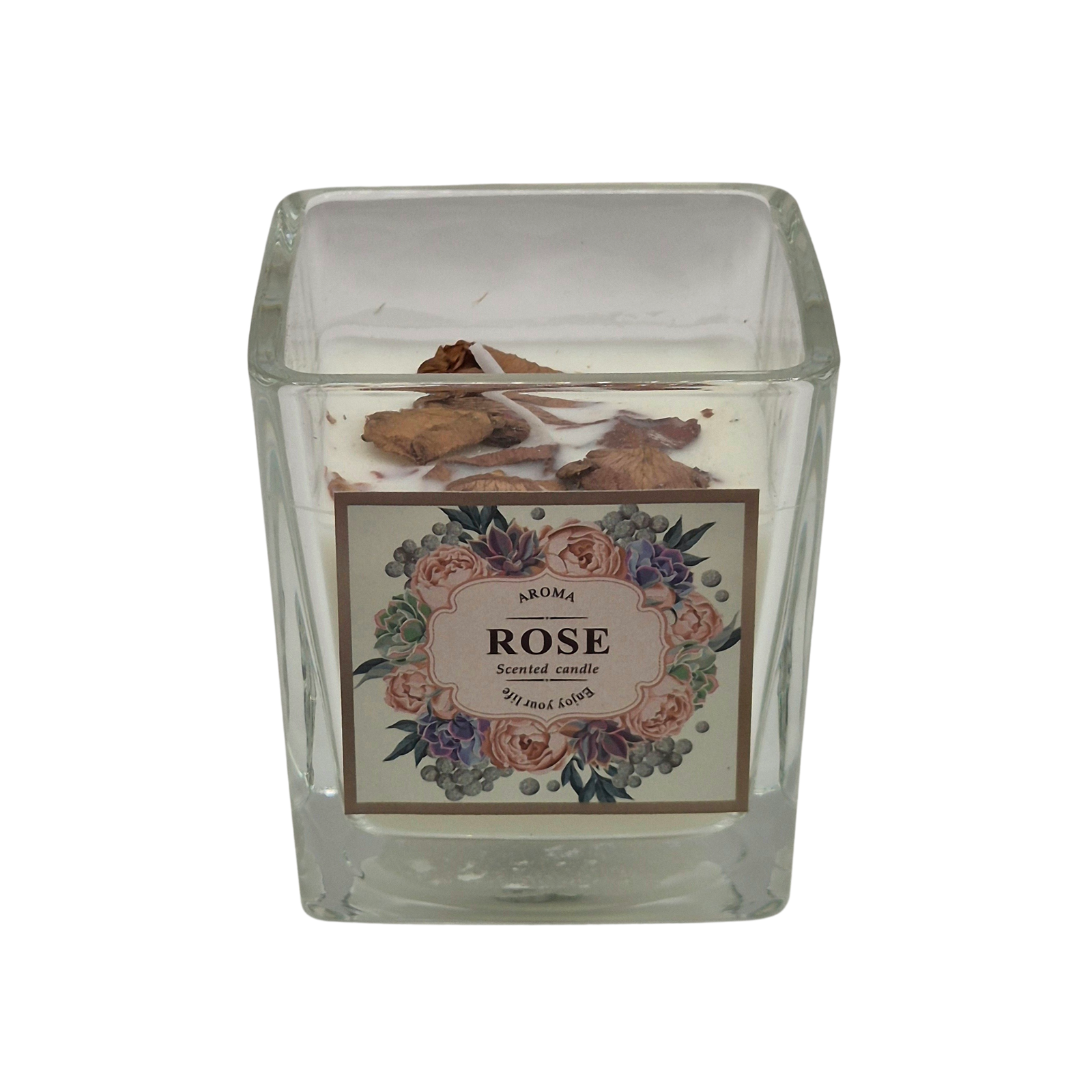 נר ריחני בניחוח ורד לבן קלאסי בתוך כוס זכוכית מרובעת. הנר מעוטר בעלי כותרת יבשים של ורדים המקנים לו מראה טבעי ורומנטי. על גבי הזכוכית מדבקה פרחונית בעיצוב וינטג’ עם הכיתוב Rose – Scented Candle, המשלימה את התחושה האלגנטית. מתאים כפריט דקורטיבי לסלון, חדר שינה או חדר אמבטיה, וגם כמתנה מושלמת לאירועים מיוחדים – יום הולדת, יום האהבה או פשוט להוספת אווירה רומנטית וחמימה בבית.
