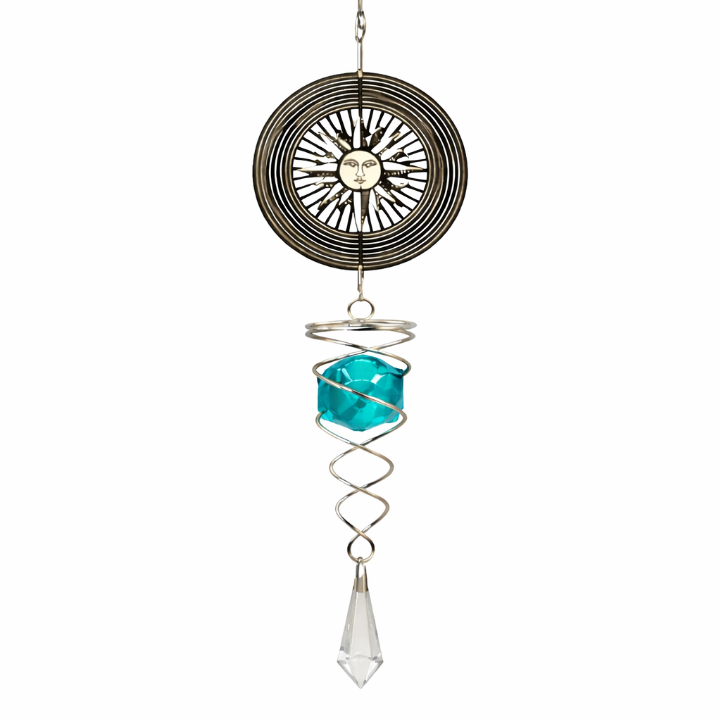 מובייל תלייה דקורטיבי בעיצוב שמש סימטרית עם תנועה מעגלית וקריסטל בגוון טורקיז רענן במרכז. הסיבוב העדין ברוח יוצר משחקי אור חמים ותחושת חיוניות, ומדגיש את סמליות השמש כמקור של כוח, תשוקה ואנרגיה פעילה. מתאים לתלייה בבית, במרפסת מקורה, ליד חלון או בפינת מדיטציה ורוגע, ומוסיף לחלל נוכחות עוצמתית, מאוזנת ודקורטיבית.