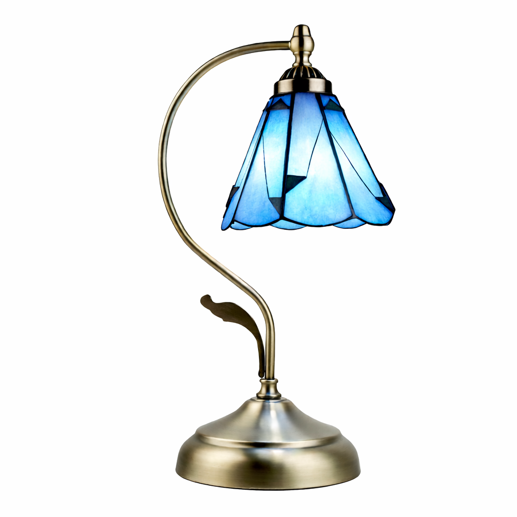 מנורת שולחן דקורטיבית בסגנון טיפאני עדין, עם אהיל זכוכית כחולה בעל קווים רכים ומבנה פרחוני. בסיס המתכת בגימור פליז יוצר שילוב הרמוני בין חמימות קלאסית לצבע קריר ומרגיע. המנורה מפיצה אור רך ונעים, ומתאימה לשולחן כתיבה, שידת לילה, פינת קריאה או סלון, ומשתלבת היטב בעיצוב קלאסי, וינטג’ או אלגנטי. פריט תאורה שהוא גם אלמנט עיצובי מלא אופי ונוכחות.