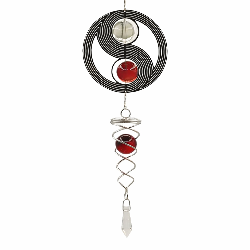 מובייל רוח דקורטיבי עשוי מתכת בגימור כסוף, בעיצוב יין-יאנג – סמל עתיק לאיזון, הרמוניה וזרימה מתמדת בין כוחות משלימים. במרכז המובייל משולב קריסטל אדום המעניק נוכחות אנרגטית, עומק חזותי ונקודת צבע חמה ודומיננטית. תנועתו הסיבובית עם זרימת האוויר יוצרת משחקי אור עדינים ומשרה תחושת איזון ורוגע. מתאים לתלייה בבית, במרפסת מקורה, ליד חלון או בפינת מדיטציה, ומשלב עיצוב אסתטי עם משמעות רוחנית.