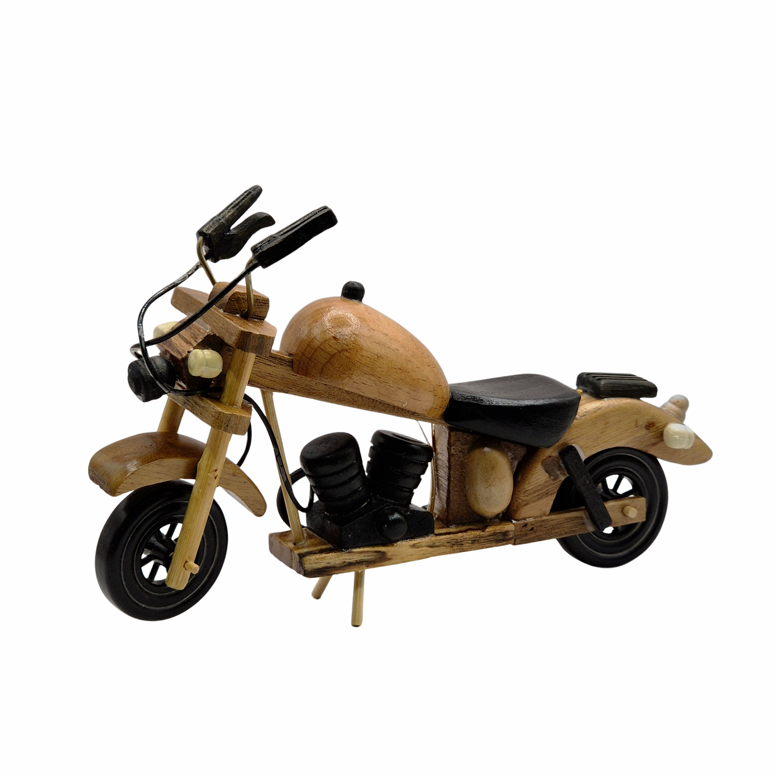 אופנוע דקורטיבי בעיצוב רטרו-קרוזר קלאסי, עשוי עץ טבעי עם אלמנטים שחורים בולטים המדגישים מראה קלאסי, אלגנטי ונוסטלגי. השילוב בין העץ החמים לצבע השחור יוצר נוכחות מרשימה בהשראת אופנועים קלאסיים, עם תחושת עבודת יד ודיוק בפרטים. פריט עיצוב ייחודי למדף, ספרייה, שולחן עבודה או פינת וינטג’, ומתאים במיוחד כמתנה לאוהבי רטרו, אופנועים ועיצוב עם אופי.