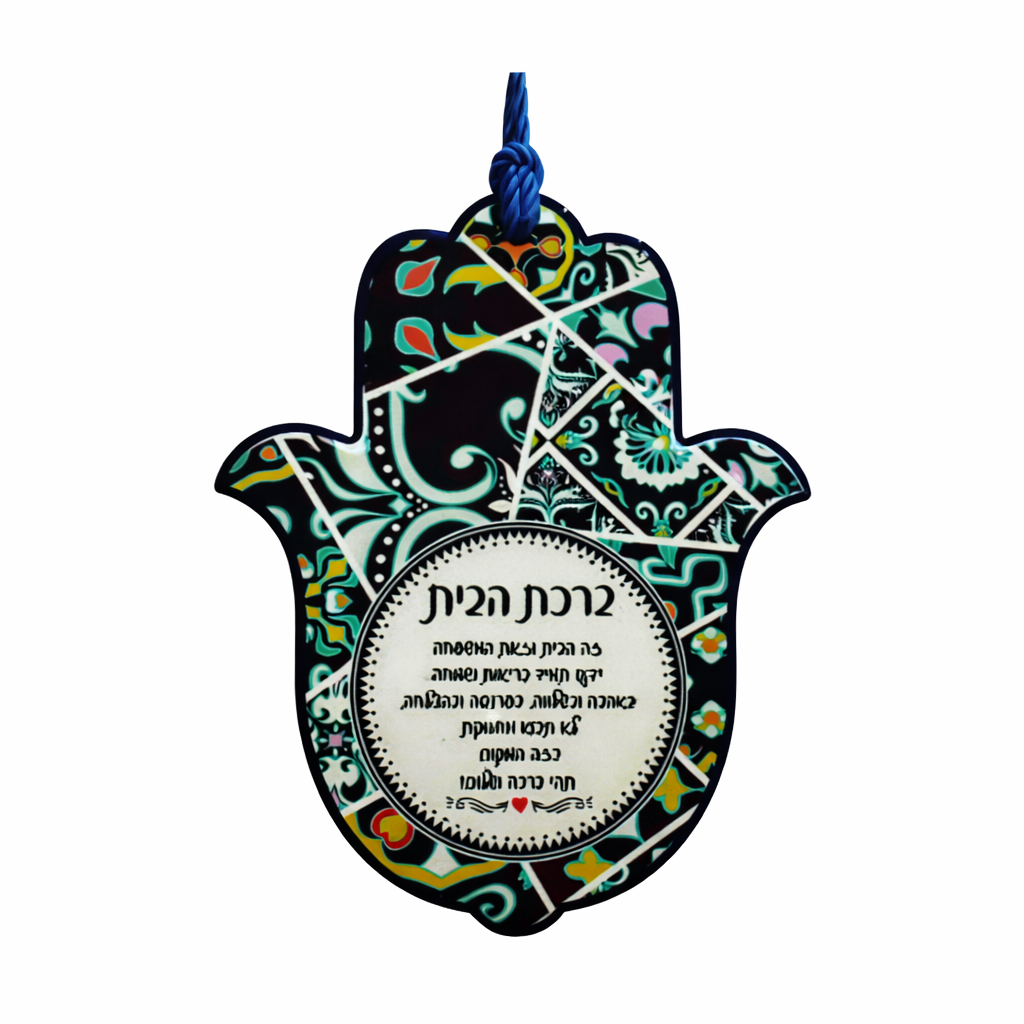 חמסה דקורטיבית לתלייה בעיצוב אוריינטלי עשיר, עם דוגמאות גאומטריות וצבעוניות וברכת הבית במרכז. החמסה מסמלת הגנה, שפע, מזל וברכה, ומשלבת מסורת עתיקה עם מראה עיצובי חם ומזמין. מתאימה לתלייה בכניסה לבית, בסלון ובחדר עבודה, וכן כמתנה מרגשת לחנוכת בית, חתונה או מעבר דירה. העיטורים האוריינטליים והצבעים העמוקים מעניקים לה נוכחות בולטת ואווירה רוחנית דקורטיבית.