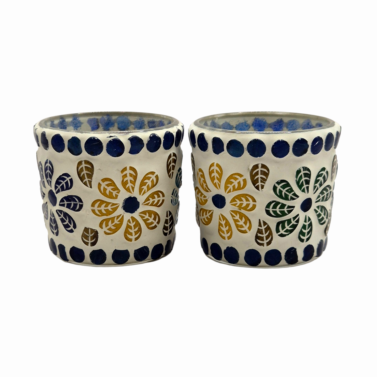 סט של שני מחזיקי נרות דקורטיביים בעבודת פסיפס עדינה, המעוטרים בדוגמת פרחים צבעונית עם עלים מעוצבים ומסגרת נקודות כחולה. כל מחזיק משלים את השני ויחד הם יוצרים מראה הרמוני, רגוע ומלא אופי. בעת הדלקת נר, האור מתפזר ברכות ומעניק תאורה חמימה ונעימה. מתאים לעיצוב סלון, פינת אירוח, חדר שינה או חלל טיפולי, כמוקד עיצובי עדין או כמתנה אלגנטית.