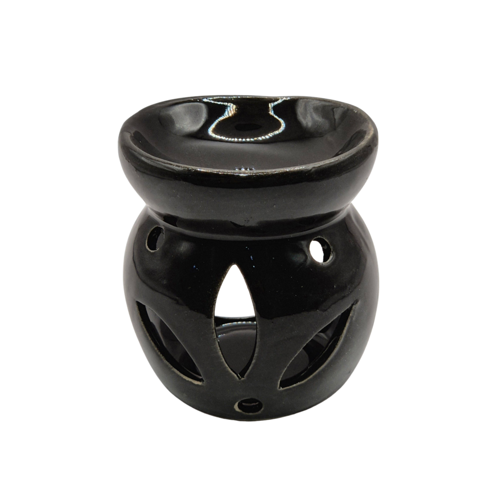 מבער שמנים אתרי קרמי בצבע שחור עמוק, עם חיתוכי עלי כותרת דקורטיביים המאפשרים לאור הנר לזרוח החוצה. מתאים לשמנים אתריים או שעוות ריח, מעניק תחושת חמימות, תשוקה ואנרגיה חיובית בחלל. מושלם לסלון, לחדר השינה או כמתנה מיוחדת.
