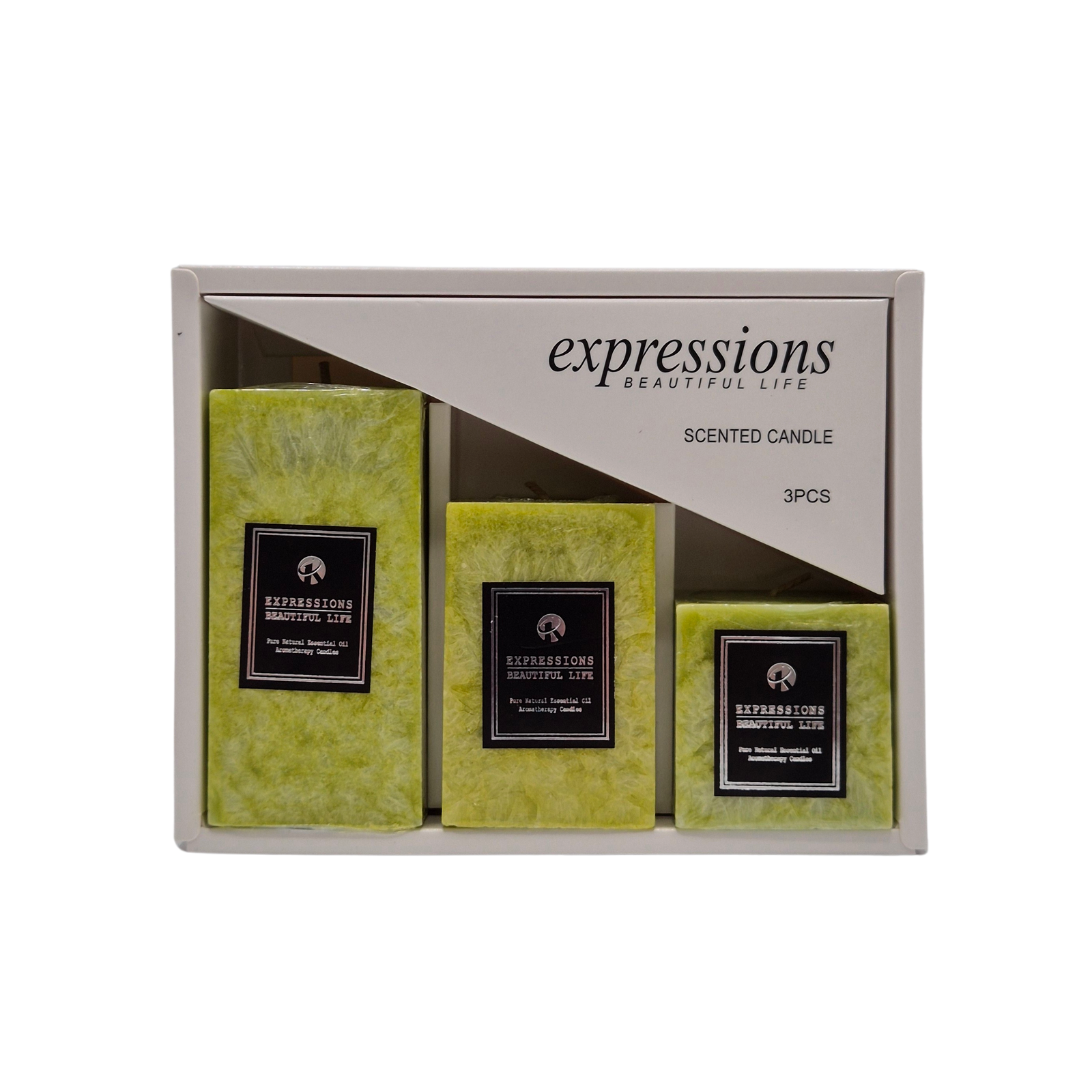 סט נרות דקורטיביים בצבע פיסטוק, 3 גדלים שונים באריזת קופסה מהודרת מבית Expressions A Beautiful Life.  חוויית ריח יוקרתית ומרגיעה, מוסיפה חמימות ונעימות לכל חלל. מושלם כמתנה מרשימה או לשימוש אישי – איכותי, מעוצב וקל לשימוש.