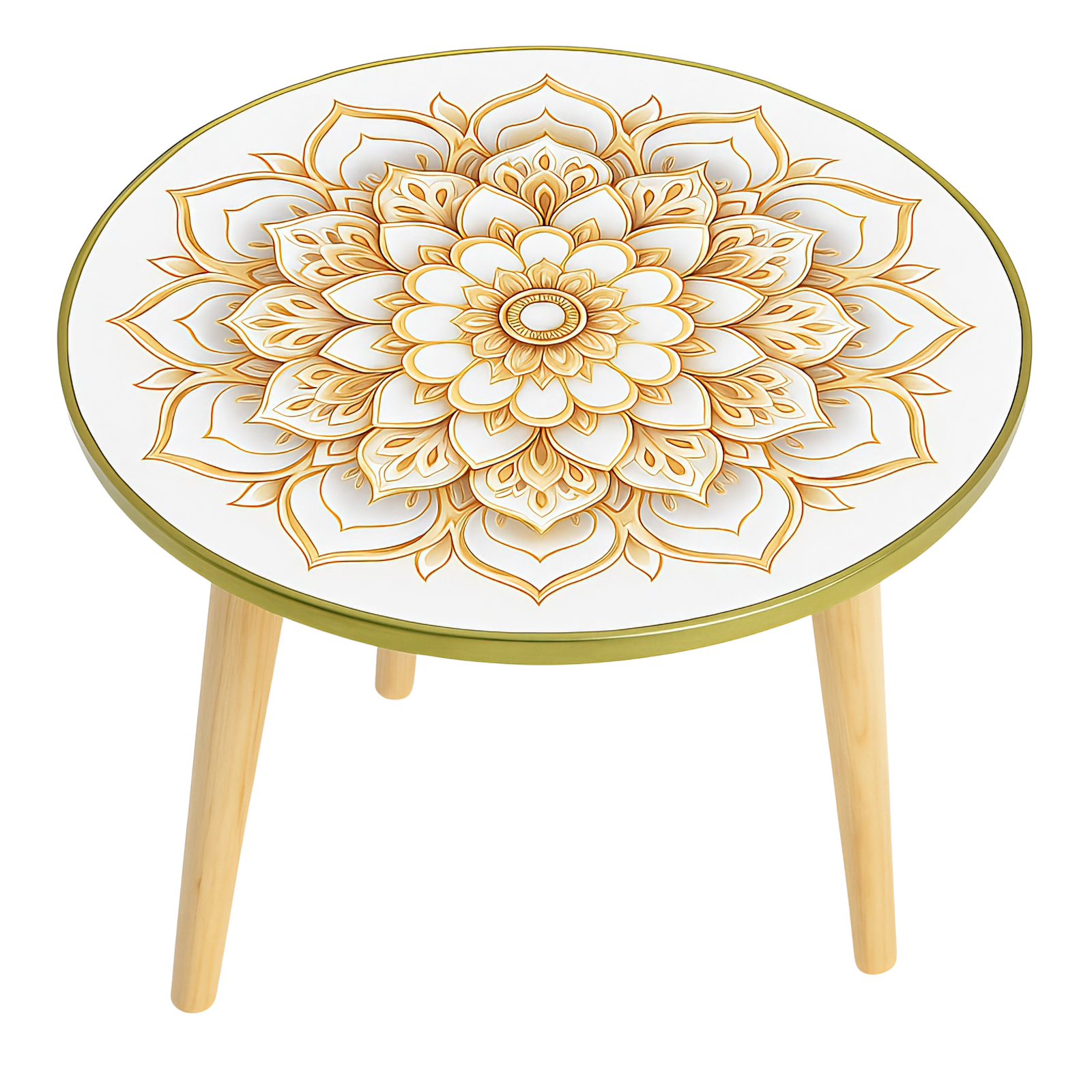 שולחן עגול אלגנטי בעל משטח לבן חלק המעוטר במנדלה סימטרית בגווני זהב וענבר. העיטור הדק והמדויק מקרין אור פנימי ותחושת שלווה, בעוד הרגליים מעץ טבעי מעניקות חמימות ונגיעה טבעית לעיצוב. השולחן משתלב בהרמוניה עם כל סגנון עיצוב – בוהו, סקנדינבי או מודרני – ומשמש כשולחן צד, שולחן קפה קטן או פריט נוי דקורטיבי המעורר השראה. מושלם ליצירת פינה רגועה ומוארת בבית. מידות המוצר: קוטר: 40 ס"מ, גובה: 50 ס"מ