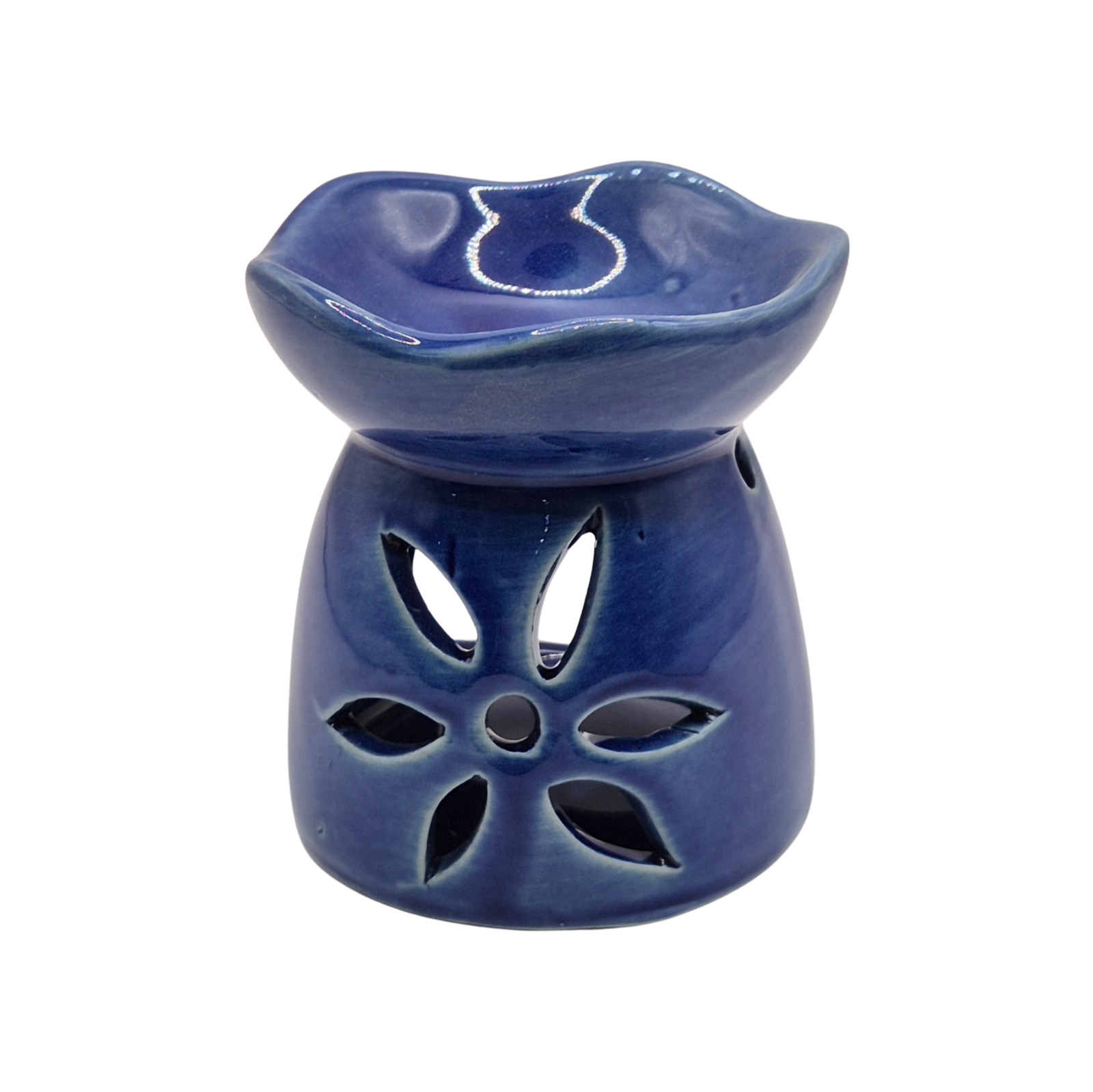 מבער שמנים אתרי קרמי בצבע כחול עמוק, עם חיתוכים דקורטיביים בצורת פרח מלא. האור החודר דרך צורת הפרח יוצר אווירה קסומה ונעימה, אידיאלי לשימוש עם שמנים אתריים או שעוות ריח. כלי פונקציונלי ודקורטיבי שמוסיף נגיעה טבעית וחמימה לכל חלל.