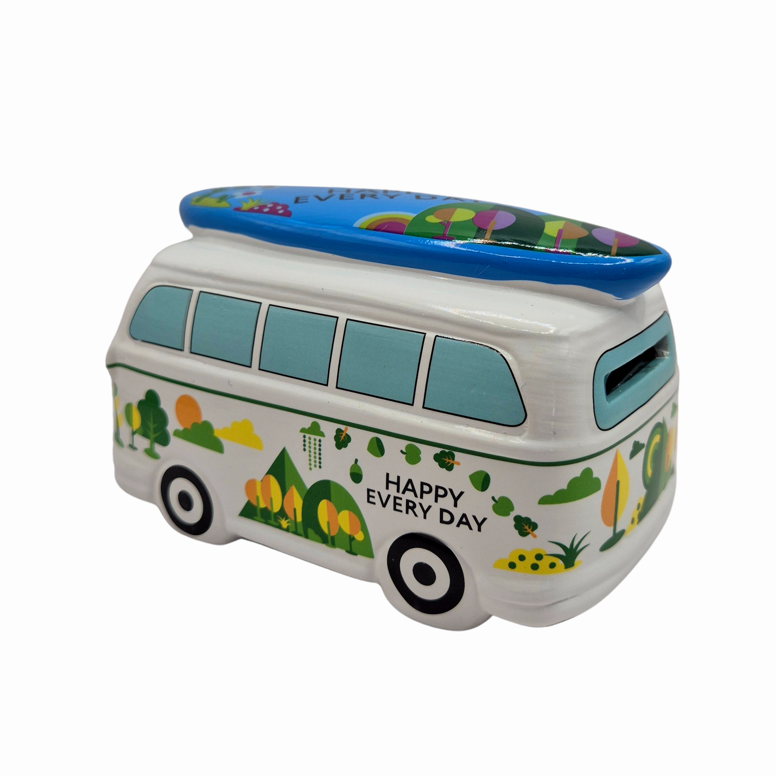 קופת חיסכון תוצרת BRISA , עשויה פורצלן איכותי בצורת אוטובוס פולקסווגן קלאסי עם גלשן על הגג בצבע כחול.