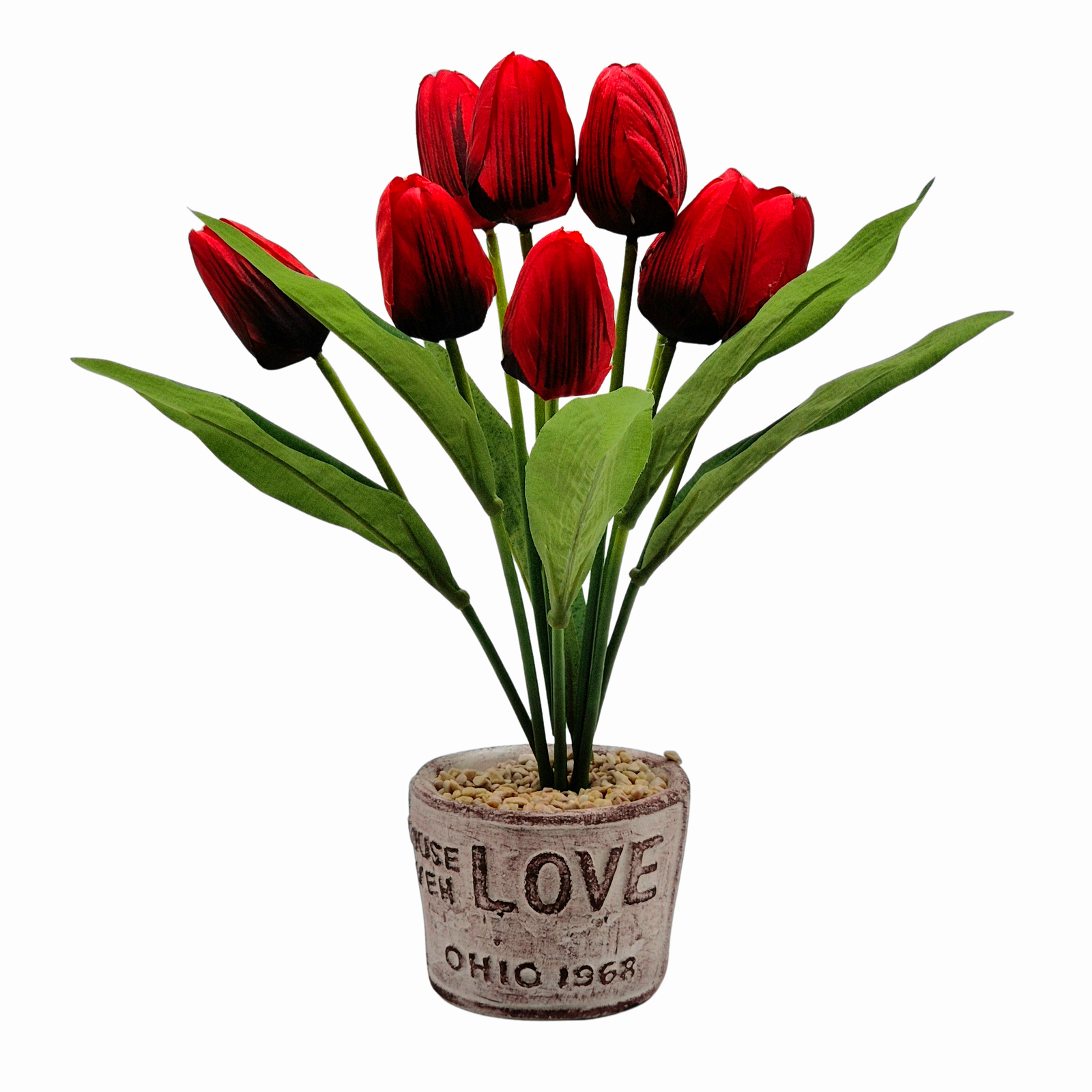 זר צבעונים אדומים בעציץ וינטג' מקסים עם הכיתוב "LOVE OHIO 1968", המעניק לו מראה ייחודי ונוסטלגי. מושלם כמתנה או לקישוט הבית והמשרד. אינו דורש טיפול ויישאר רענן ויפה לאורך זמן.