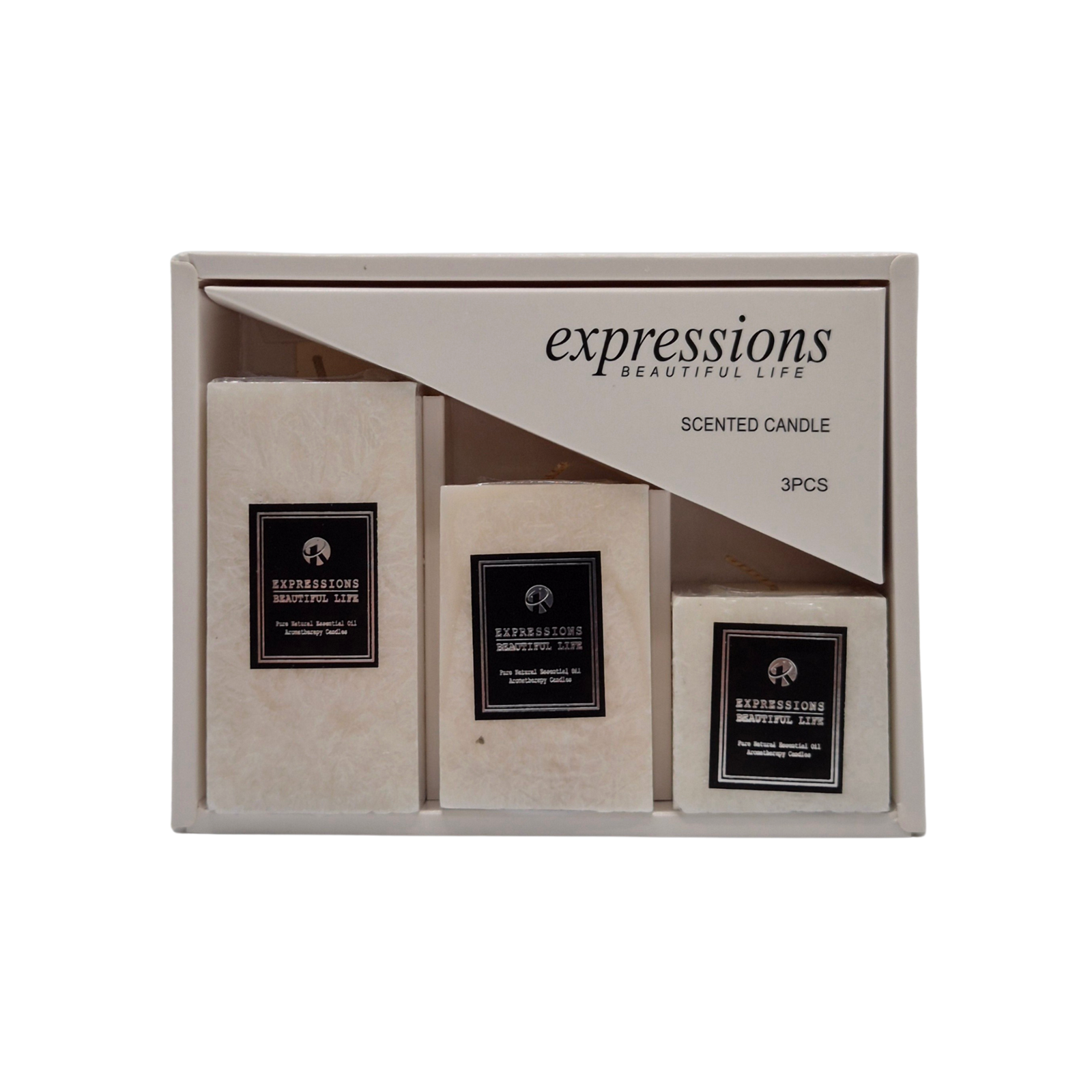 סט נרות דקורטיביים בצבע שמנת, ב-3 גדלים שונים מבית Expressions A Beautiful Life. אריזת קופסה מהודרת המספקת חוויית ריח יוקרתית ומרגיעה, ומוסיפה חמימות ונעימות לכל חלל. מושלם כמתנה מרשימה או לשימוש אישי – איכותי, מעוצב וקל לשימוש.
