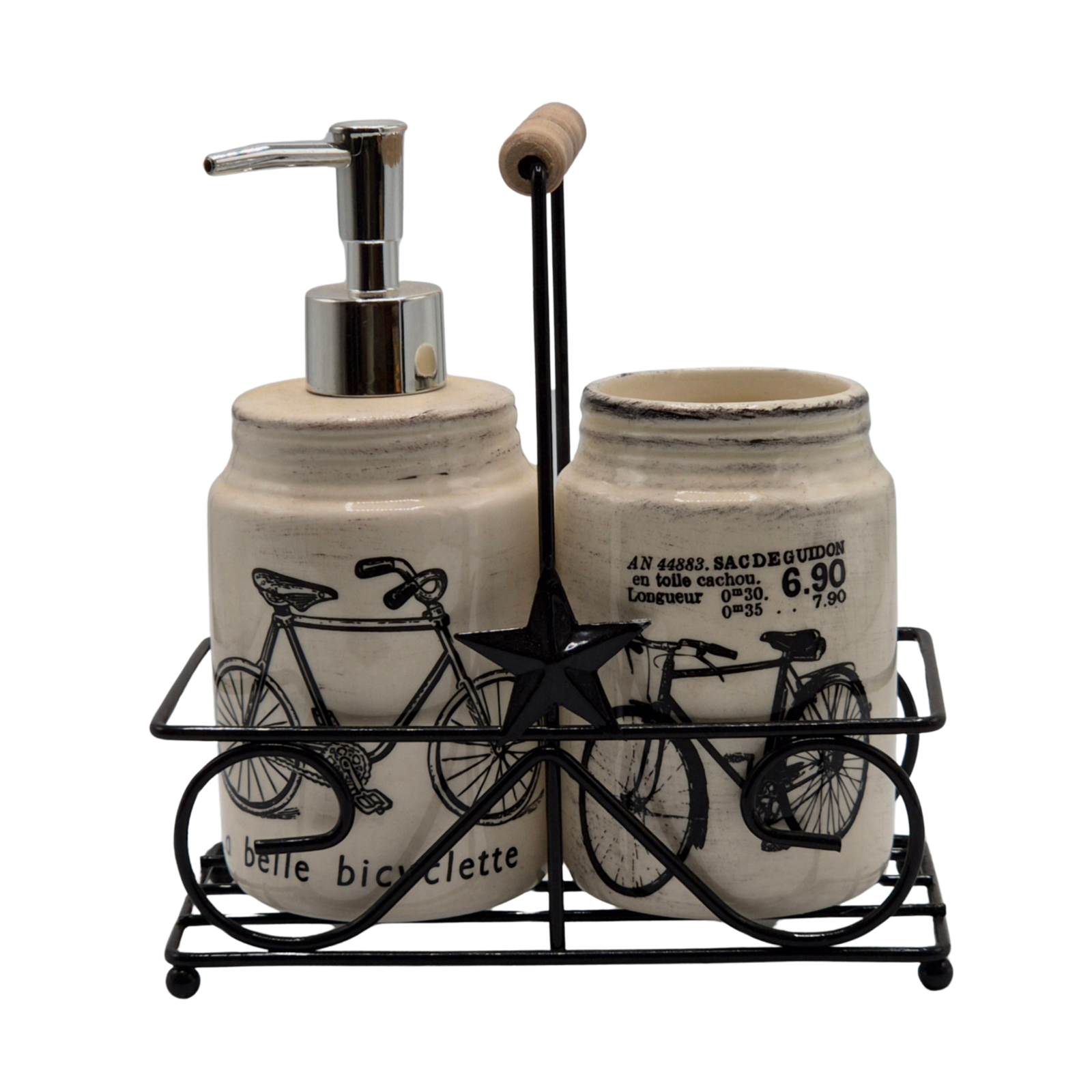 הסט המעוצב "La Belle Bicyclette" מביא אתו ניחוח פריזאי נוסטלגי לחדר הרחצה או למטבח. שני הכלים עשויים קרמיקה בגוון שמנת טבעי, עם איור אופניים קלאסיים וכיתוב בצרפתית שמוסיף אופי אירופאי אלגנטי. המעמד המתכתי השחור משלים את המראה הכפרי-אורבני, והידית מעץ מוסיפה חמימות טבעית ונוחות נשיאה. הסט מתאים לסבון נוזלי, מברשות שיניים, סכום קטן או כלי רחצה, ומושלם גם כמתנה.